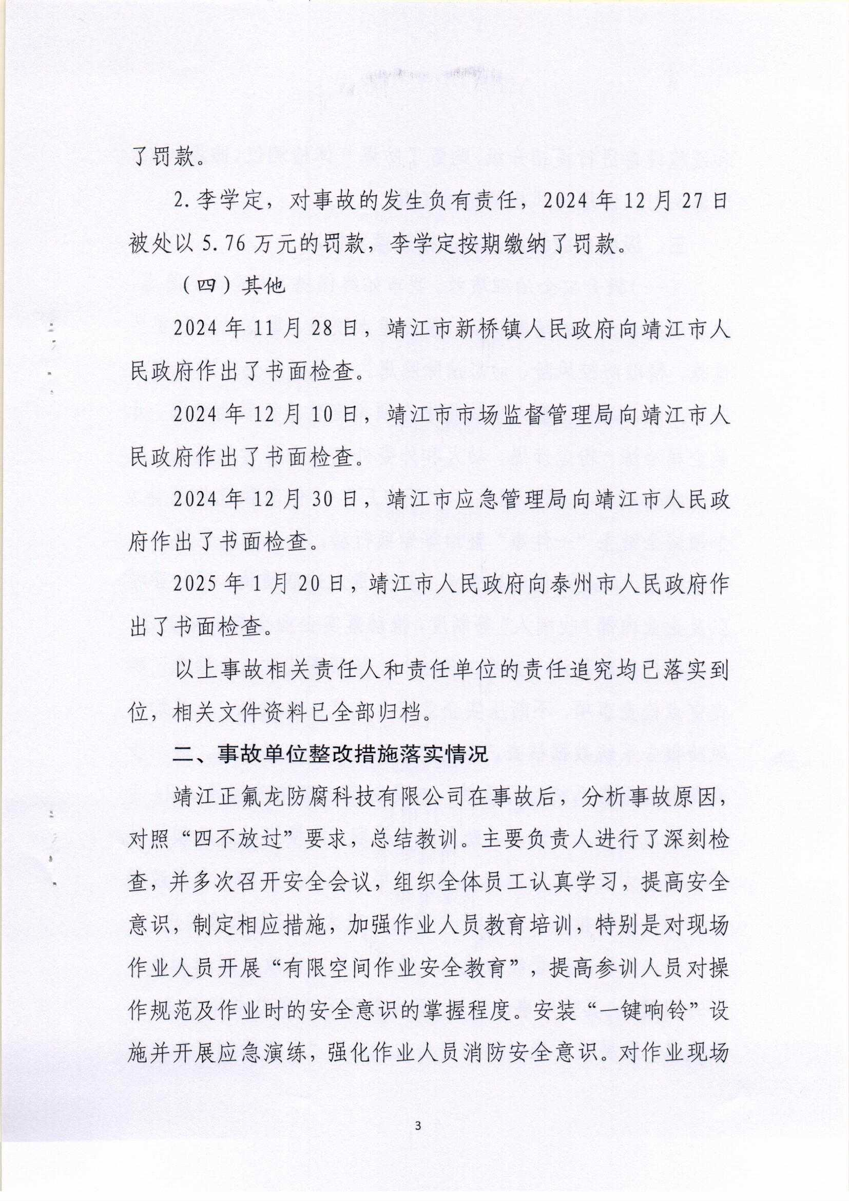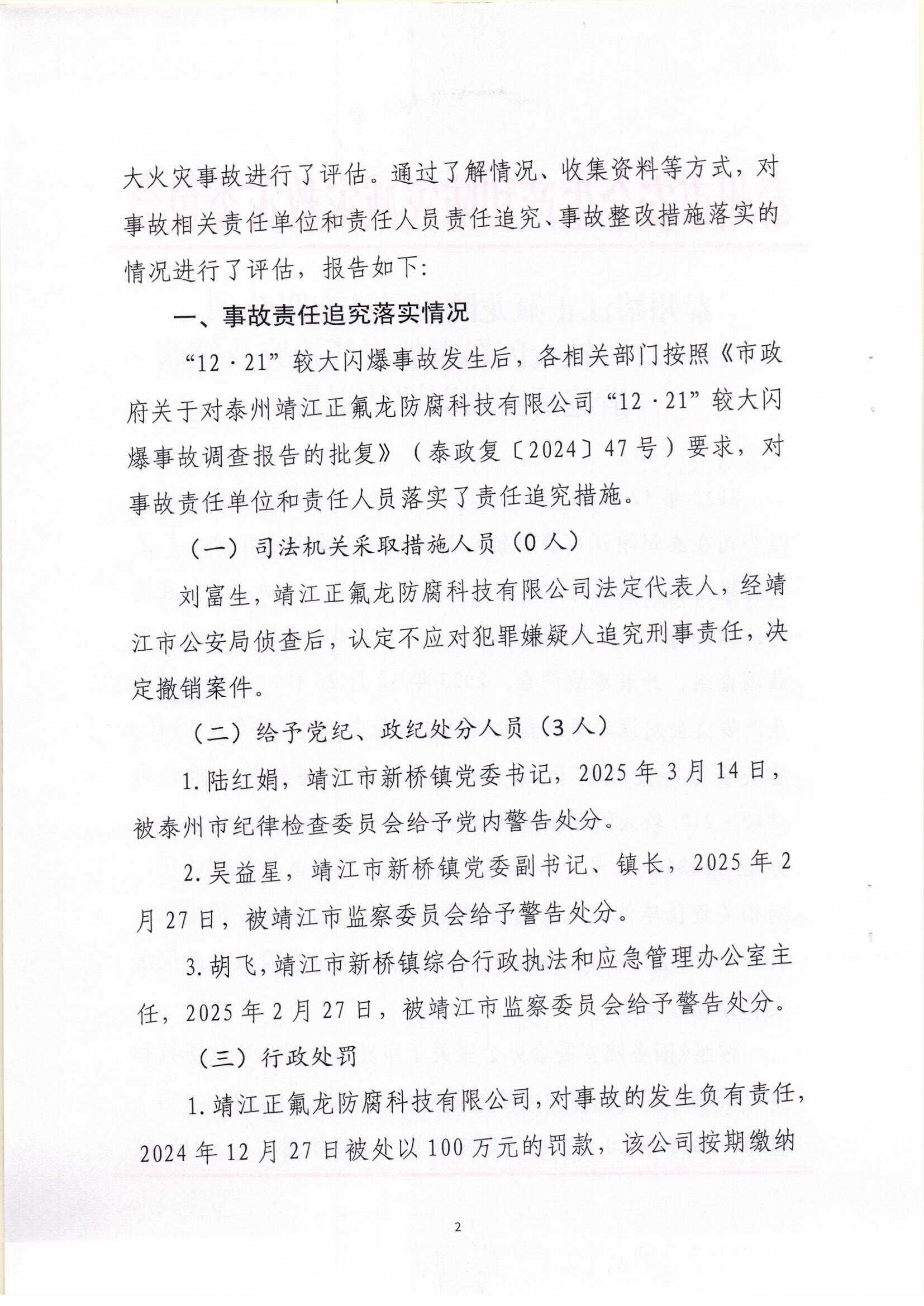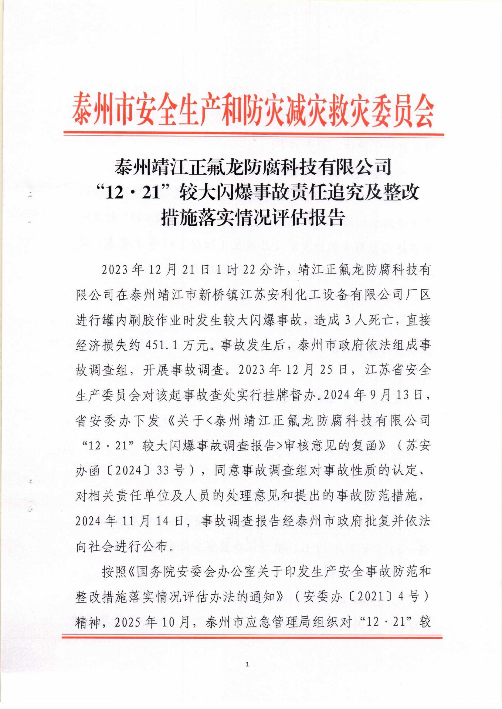 泰州靖江正氟龙防腐科技有限公司“12·21”较大闪爆事故责任追究